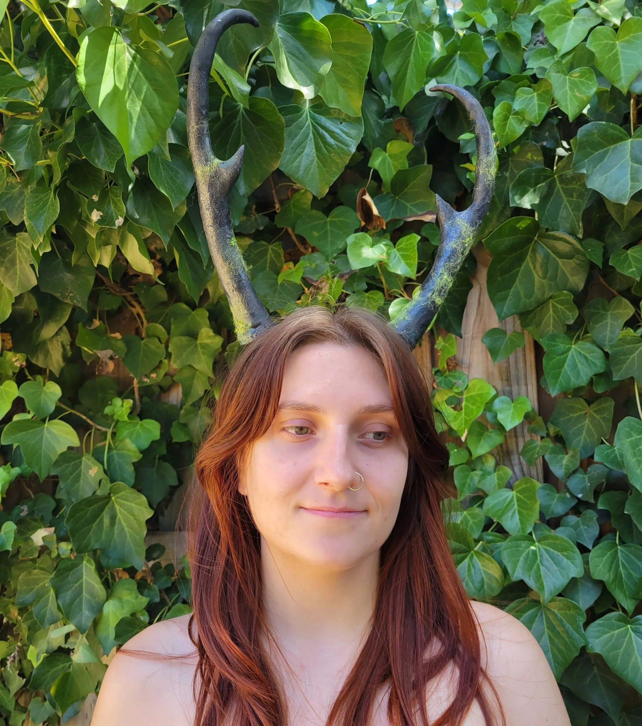 I hot glued artificial leaves together to resemble armour, to highlight the client’s shoulders. This was intended to express the strength of a protector of the forest.