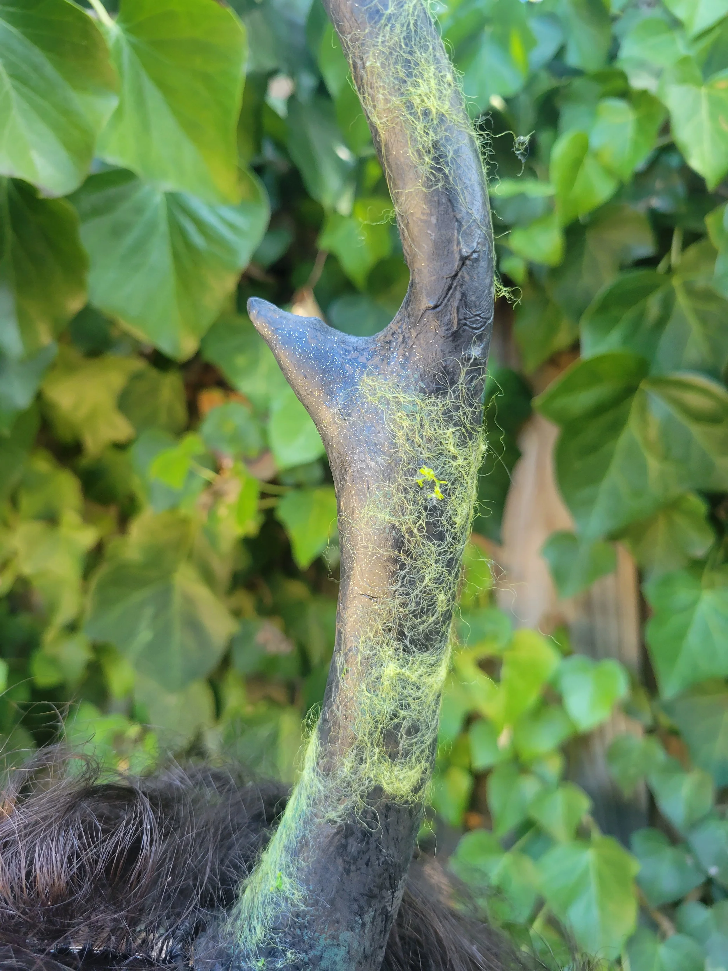 I sculpted antlers from wire, aluminium foil and foam clay, painted them and covered them in fibres and glue to resemble lichen.