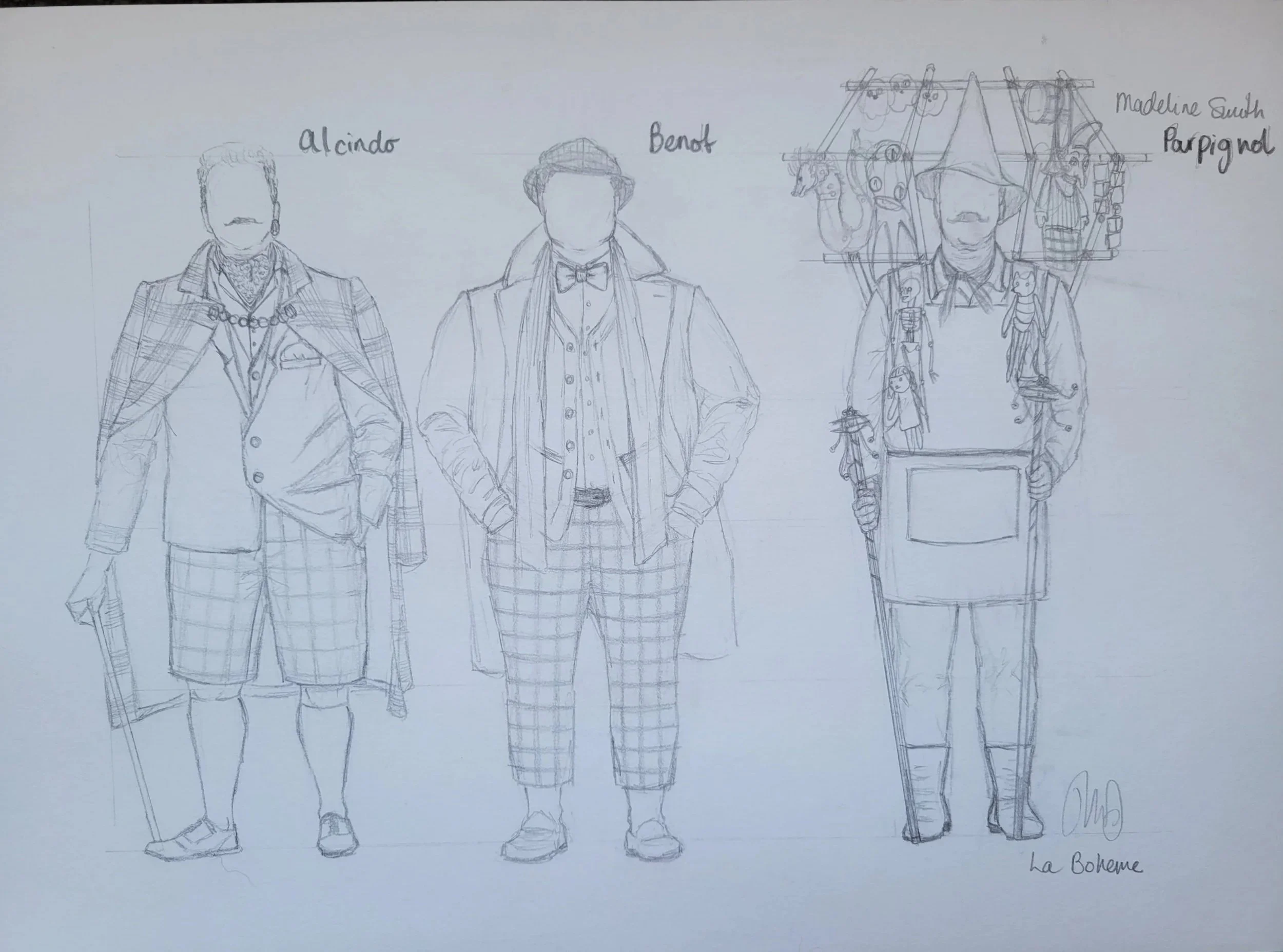 During my time at The Victorian College of Arts, my final design project was to create a concept for the opera La Boheme, with two other production design students. One of them was focused on the set, one was focused on the technical design, and I was tasked with creating the costume designs. Our concept had references inspired by the culture and aesthetics of the Eastern European Traveller or Romani people in reference to the bohemian world. We wanted to explore themes of romance, whimsy and magic surrealism through the use of eclectic imagery. I wanted my designs to express a real sense of temperature and wanted the characters costumes to express their personality and values through the use of meaningful iconography and direct references.