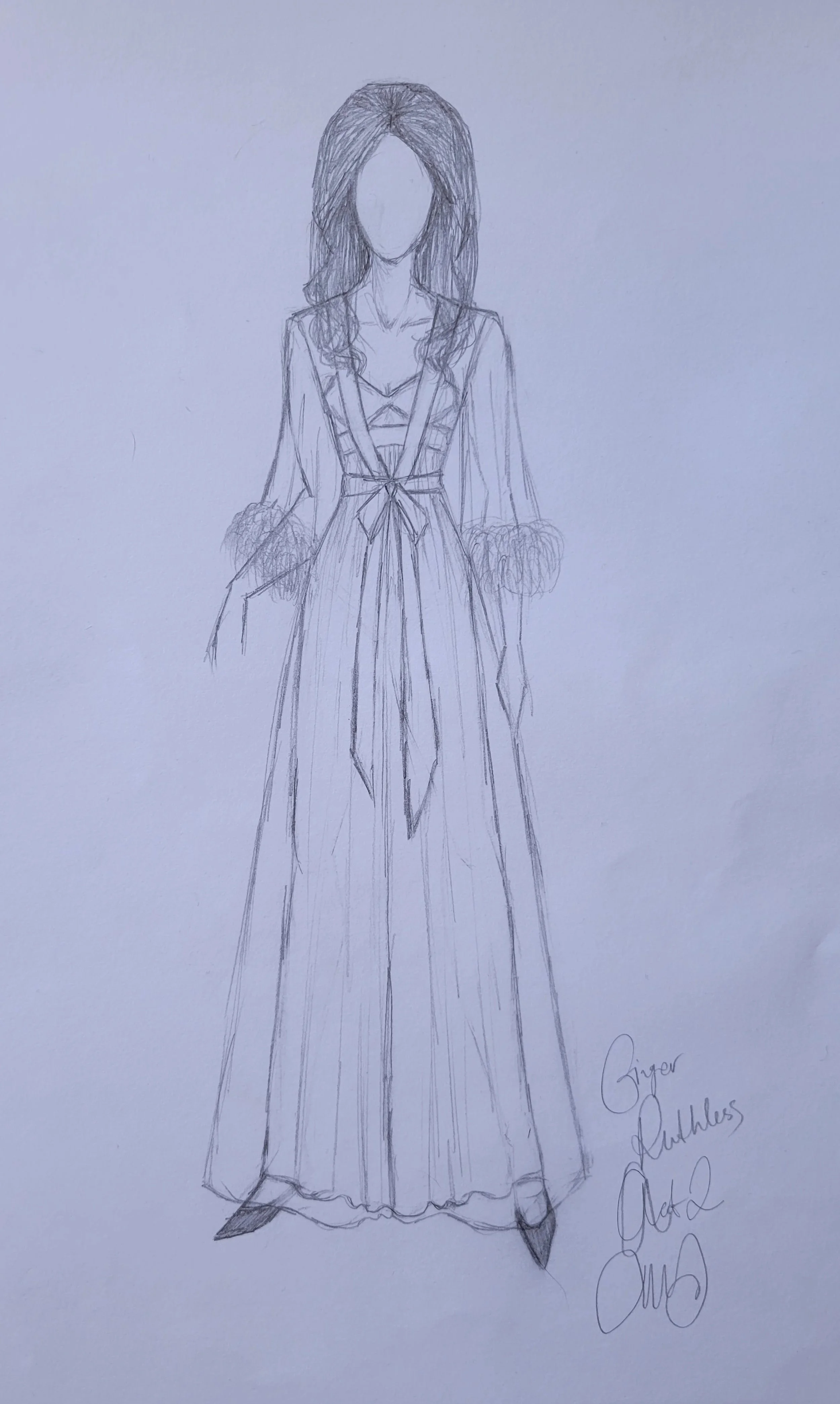 For Ginger Del Marco’s Act two look, my sketch for this costume is to the right, I sewed two wigs together, displaying skills I learnt from watching Drag Queens online.