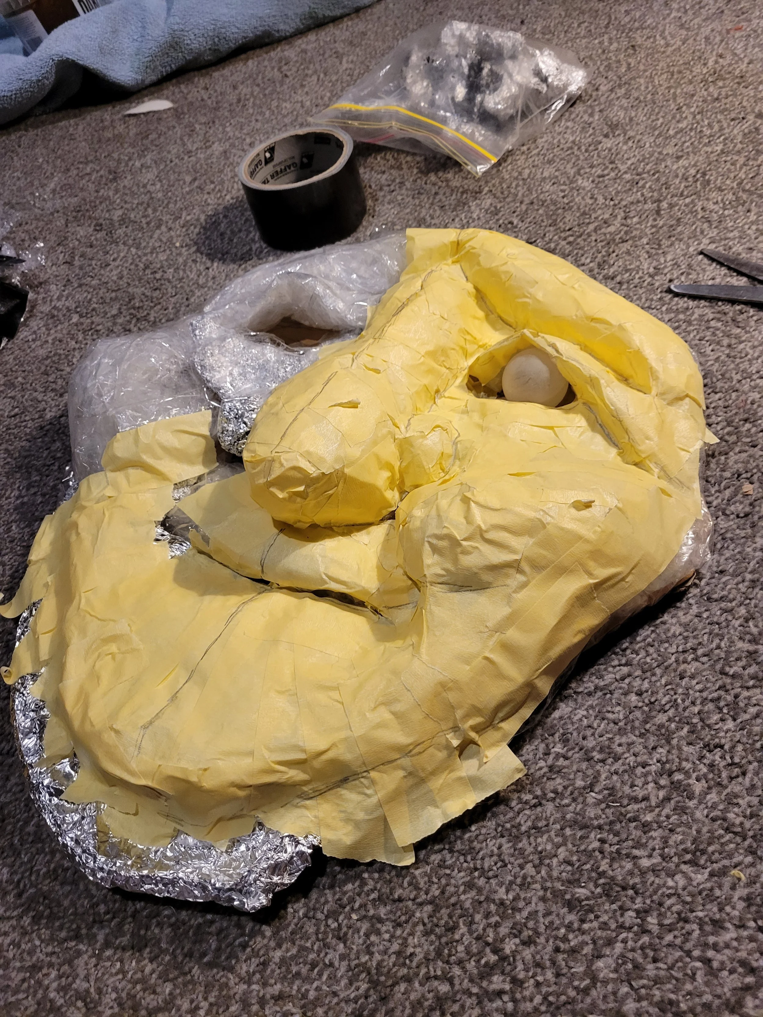 To make the face, I first sculpted it out of recycled plastics and then covered it in masking tape to create a pattern, which I then cut out of felt and stuffed with textile scraps and recycled polyester filling. The face is a very important part of this piece; I would like the audience to connect with the piece through this character. This connection will hopefully be achieved at the completion of the face, and their eyes especially. The face right now has an almost Jim Henson quality to it and evokes feelings of nostalgia to me - a theme I wish to explore further with the piece.