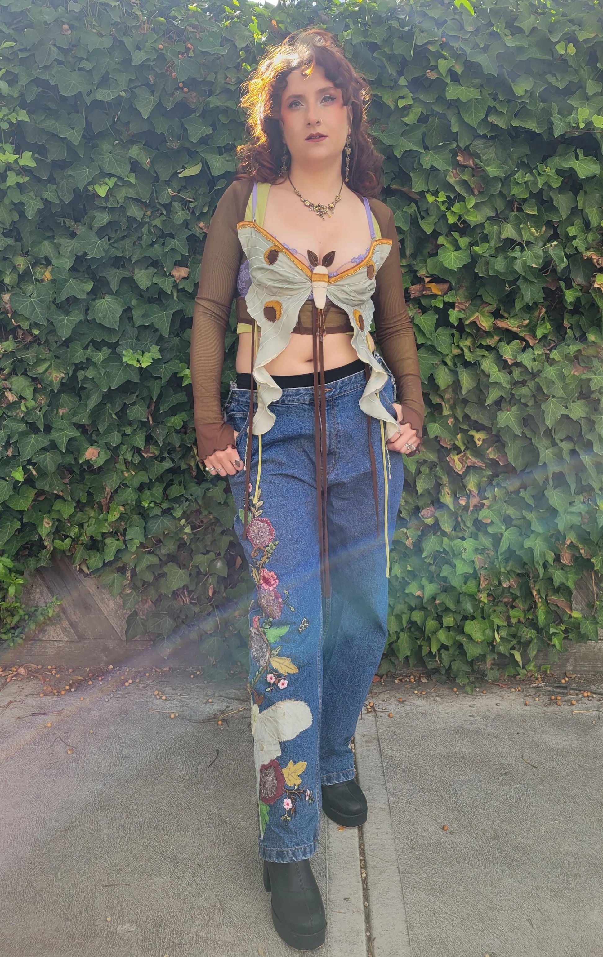 The finished jeans inspired the top. The festival headliner was Chappel Roan, and she had a luna moth look. The concept was simple; the top would bring a detailed version of the luna moth up into the focus of the look. I have been obsessed with luna moths for a while, and have made a few with fabric, meaning I have studied their wing structure before. I knew the bottom wings curl up, when straightened twisted and swirled, similar to a technique used in sewing. I wanted this effect to be a key feature of my top. I thought by adding beads to the base of the wings, I could ensure the appropriate hang to maintain the effect, I also incorporated hanging beads off other places on the moth.